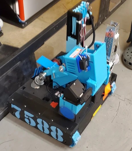 This year, we took the modular design process to the max. We had a 3D-printed chassis with specific ports to add modules. These ports were attached with only 1-2 screws, and would easily connect or disconnect to pre-placed motor and servo cables. A tank design was decided upon to allow us to cross the barrier. We had a pass-through intake and elevator system utilizing TPU flippers and a motor, as well as a scaled-down channel slider kit from Actobotics. On the side, we had a scissor lift to extend a spinner for the carousel. An arm for the team shipping element was prototyped, but never fully implemented.