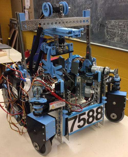 Our robot, “Clawdia”, had a very unique custom designed drivetrain system called Swerve Drive. No other Minnesota FTC team was using this drivetrain on their robot. It had the ability to rotate its wheels, allowing the robot to travel with three degrees of freedom, giving it maneuverability on the field. Over time, we found that Swerve Drive is very complicated and time consuming, and decided as a team that it will become an off-season project. We have since switched to a mecanum drivetrain, because it still gives us the maneuverability we want, without the added complexity. We can easily switch to a different drivetrain, because we used the modular design method. We designed systems (or modules) separately, using our design process, and created them to fit together on our swerve or mecum drivetrains. Our modules include a CAD designed wheeled stone intake system and grabber that pick up stones on the field. The grabber is raised up by an elevator, made up of two drawer slide systems, and moves through the robot on a shuttle, that is a CAD designed rack and pinion. We hope this design limits the travel the robot has on the field to retrieve stones, and quickly delivers them to the foundation. We also have two servo, sprocket and chain driven arms that grab onto and move the foundation in and out of the building site.