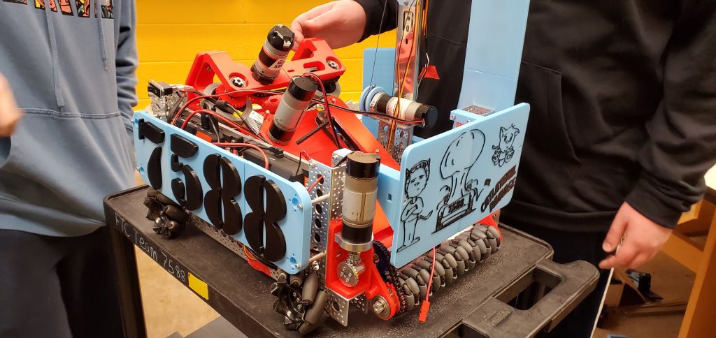 This year we decided on a modular design system so we can easily swap parts as needed. We have the intake, belt system, and shooter, all in red, to pick up the rings from the ground and fire them from the shooter. The intake uses compliant wheels, or grippy wheels, to pull in the rings. The belt system uses belts along the side to push the rings up. The shooter has two super fast wheels on both sides to shoot the rings into the goals. On the side, we have our wobble goal grabber attached to a drawer slide so that we can lift the wobble goal off the ground.